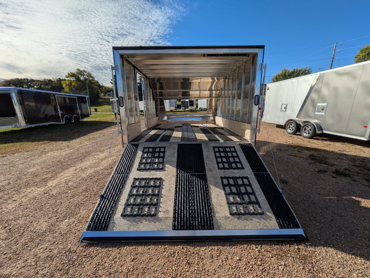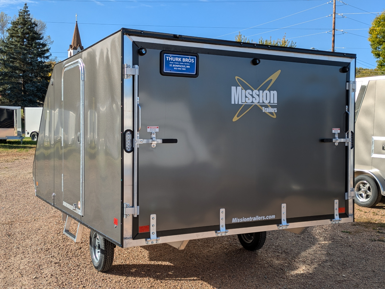 Just In! 2026 Mission Enclosed 2 place snowmobile trailer. Upgraded straight sides, tapered rear ramp edge, 32x70 radius corner side door w/step, 30x60.5 front access door, Caliber ski guides, trax grabbers and track mats. Top notch trailers. Charcoal gray and White available now.